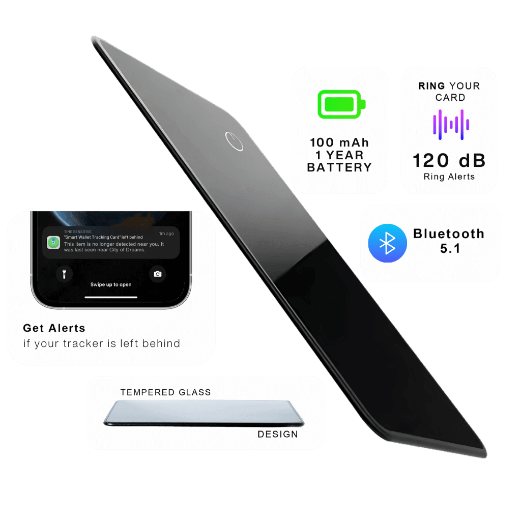Track smarter with a 1-year battery, 120dB sound, anti-loss alerts, Bluetooth 5.1, and a tempered glass body — all packed into one ultra-thin card.